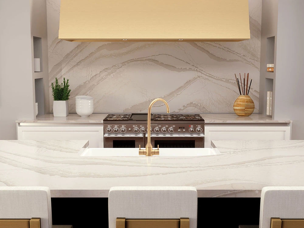 Что касается кварцевых кухонных столешниц, островов и столешниц, кварц — довольно долговечный и визуально красивый вариант. Он может быть изготовлен с различными профилями и даже имитировать внешний вид натуральных камней, таких как мрамор Калакатта.